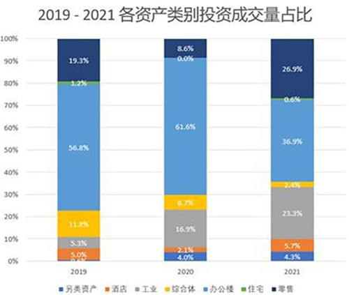 2021年,中國大陸商業(yè)地產(chǎn)投資市場表現(xiàn)良好,交易活躍達390億美元,同比攀升21%。 全年辦公樓資產(chǎn)的投資額仍占首位,占總成交量的近四成;物流資產(chǎn)成交量漲幅明顯,從2019年的169億迅速增長到了2020年的380億,并在2021年迅速攀升至591億,在總成交量的占比從2019年的5.3%大幅提升到2021年的23.3%;零售資產(chǎn)大規(guī)模資產(chǎn)包的收購抬高了總體成交量,至近三成;另類資產(chǎn)的投資金額也在2021年創(chuàng)下了新高,占比高達27%。