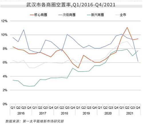 第一太平戴維斯日前發(fā)布武漢商業(yè)地產(chǎn)市場報告指出,2021年武漢在線教育行業(yè)退租潮持續(xù)發(fā)酵,寫字樓市場凈吸納量季內環(huán)比銳減40.5%,但全年需求較2020年明顯回升,空置率徘徊高位使租金仍處于下行通道;零售市場新增項目入市推動非核心區(qū)商業(yè)活力提升,餐飲、休閑業(yè)態(tài)表現(xiàn)優(yōu)秀,助推購物中心社交體驗。
