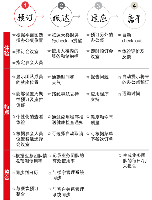 下圖展示了仲量聯(lián)行為客戶開發(fā)的體驗路徑圖示例,用于幫助確定辦公室預訂應用程序需包含哪些功能。