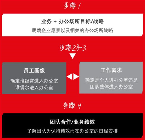 以上六大要素能夠幫助企業(yè)了解如何打造混合辦公場所,下圖是確定企業(yè)需求并打造混合辦公場所的建議步驟。企業(yè)應尋找能夠滿足自身員工特定需求的混合辦公策略,確保員工和團隊在辦公室發(fā)揮應有的績效。仲量聯(lián)行認為,混合辦公模式打造沒有一個確定之法,“以人為本”地了解員工需求,可以幫助制定正確的混合辦公策略,讓辦公場所的設計與員工及團隊的需求保持一致。