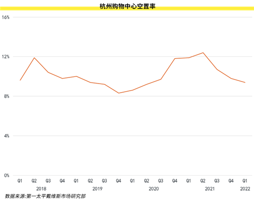 受疫情延誤影響,2022年第一季度杭州零售市場無新項目入市,全市優(yōu)質(zhì)購物中心存量維持在580萬平方米。全市優(yōu)質(zhì)購物中心首層租金保持穩(wěn)定,達人民幣15.2元每平方米,盡管過去三個月租金未發(fā)生較大變化,但隨著嘉里中心、湖濱銀泰和萬象城等核心項目經(jīng)過一系列租戶組合及運營升級后,這些項目預(yù)計會在未來幾個季度實現(xiàn)租金上漲。同時,第一季度全市優(yōu)質(zhì)購物中心空置率環(huán)比下降0.4個百分比,達到9.4%,考慮到2022年亞運會前后市場將有大量新增供應(yīng),業(yè)主都在想方設(shè)法降低項目空置率。