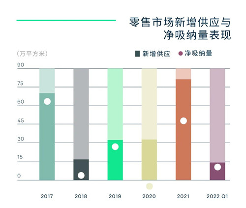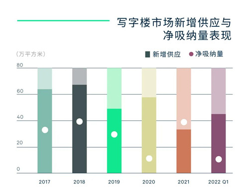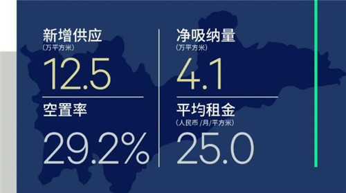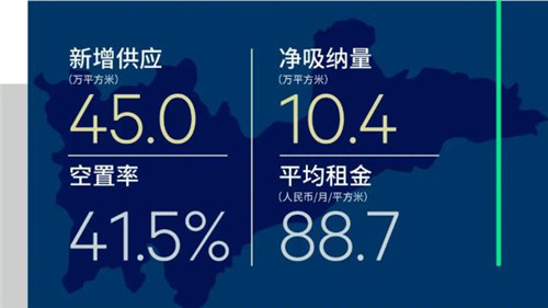 全市凈吸納量錄得10.4萬平方米,雖較四季度有所回落,但與2021年一季度相比需求回暖12.1%。雖租賃需求企穩(wěn),但大量新增供應(yīng)使空置率承壓,全市空置率再度回到40%的高位至41.5%。