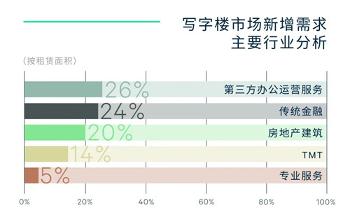 行業(yè)需求方面,第三方辦公服務(wù)運(yùn)營在經(jīng)歷行業(yè)洗牌后,于本季度再度活躍,成為甲級(jí)寫字樓第一租賃需求來源,新增租賃占比達(dá)25.6%。除本土包租公司外,本季度亦錄得聯(lián)合辦公品牌擴(kuò)租。傳統(tǒng)金融、房地產(chǎn)建筑、TMT行業(yè)租賃需求穩(wěn)定釋放,新增租賃占比分別達(dá)23.9%、19.7%和13.9%。金融行業(yè)改革深化利好證券、基金、資管類企業(yè)擴(kuò)張。國資背景的房地產(chǎn)建筑類企業(yè)及其上下游公司季內(nèi)升級(jí)擴(kuò)租活躍。而TMT新增需求的細(xì)分行業(yè)回歸到底層技術(shù)研發(fā)和企業(yè)服務(wù)應(yīng)用。前四大行業(yè)貢獻(xiàn)全市超過80%的新增租賃需求。