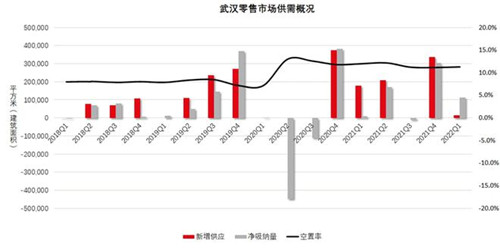 租金整體較平穩(wěn),空置率小幅上升。目前武漢零售業(yè)市場處于疫情之后的恢復(fù)期,2021年,我市實現(xiàn)社會消費品零售總額6,795.04億元,比上年增長10.5%,增速明顯,但并未完全恢復(fù)到2019年的水平。與2019年相比,餐飲業(yè)營業(yè)額增長了12.4%,基本恢復(fù)并有所提升。業(yè)主方也在積極恢復(fù)原有的租金水平,今年一季度,武漢優(yōu)質(zhì)零售市場凈有效租金呈平穩(wěn)趨勢,全市首層非主力店凈有效租金環(huán)比微升0.2%,至380元每平方米每月。但受到整體消費動力、品牌擴張速度以及未來供應(yīng)等因素影響,總體恢復(fù)態(tài)勢保持穩(wěn)中有進(jìn)。