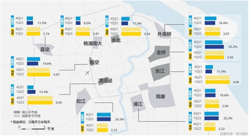 2022年第一季度產(chǎn)業(yè)園區(qū)市場(chǎng)因春節(jié)假期影響進(jìn)入傳統(tǒng)淡季,再加之3月底開始的上海全域靜態(tài)管理措施,使得產(chǎn)業(yè)園區(qū)市場(chǎng)的凈吸納量在本季度環(huán)比下降了約60%。然而,本季度的平均租金環(huán)比上升了0.7%,保持著2021年以來的平均增速。