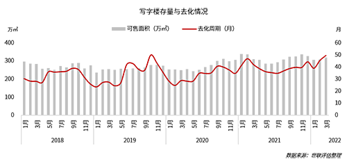 ◇全市庫存面積截至一季度末為318.77萬平方米,去化周期超49個(gè)月:一季度北京寫字樓市場整體庫存量有所減少,但去化周期受銷售不佳影響,拉升至49.46個(gè)月,達(dá)到2020年以來的新高。1月份由于銷售表現(xiàn)相對較好,去化周期下降至38.90個(gè)月,但隨著2-3月份銷售下行(2月銷售面積僅為0.47萬平方米),市場去化壓力持續(xù)增大。