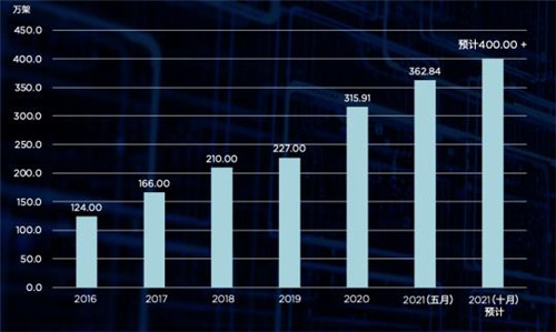 圖1:中國(guó)數(shù)據(jù)中心機(jī)柜存量(2016年 - 2021年)