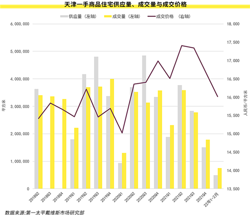 在疫情反復(fù)等因素的影響下,天津住宅市場的房源供應(yīng)量和成交量驟然減少,成交均價也有所下跌。1-2月份新建住宅供應(yīng)面積49萬平方米,環(huán)比、同比分別下降67.4%、56.6%;成交面積75萬平方米,環(huán)比、同比分別下降58%、36.8%;成交均價為每平方米16,015元,環(huán)比、同比分別下降4%、2.9%。