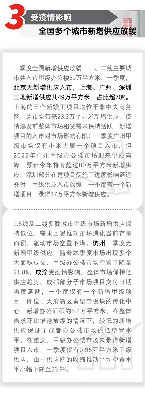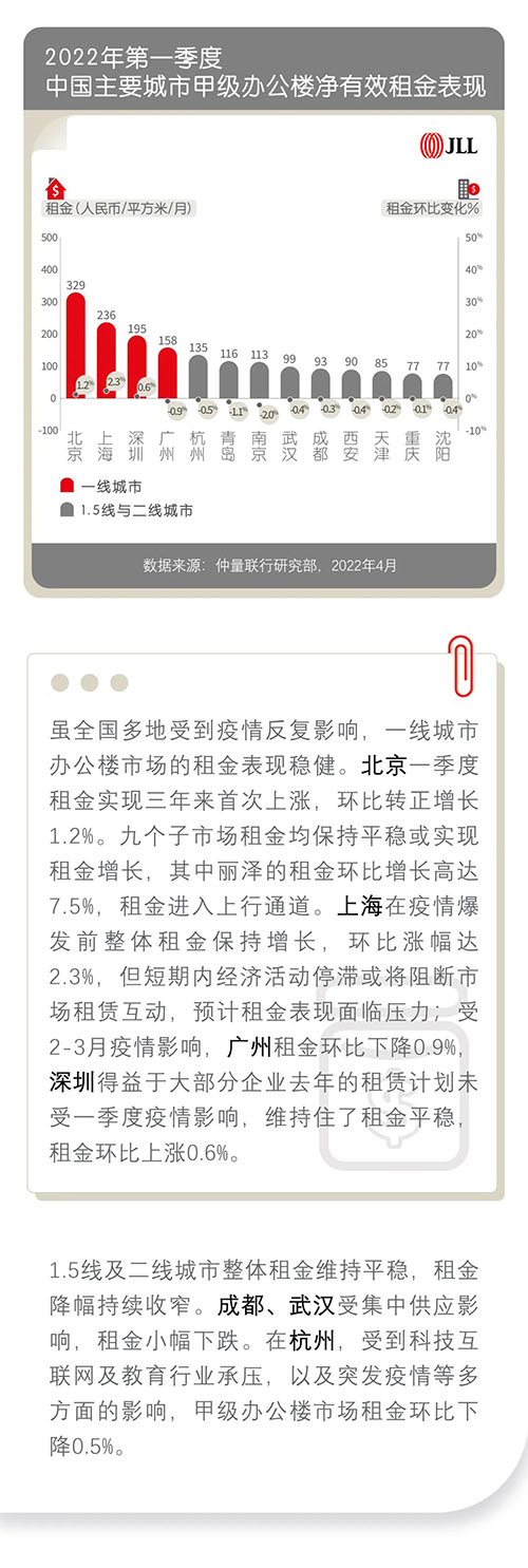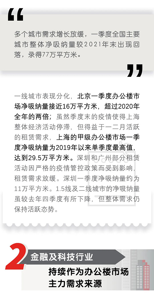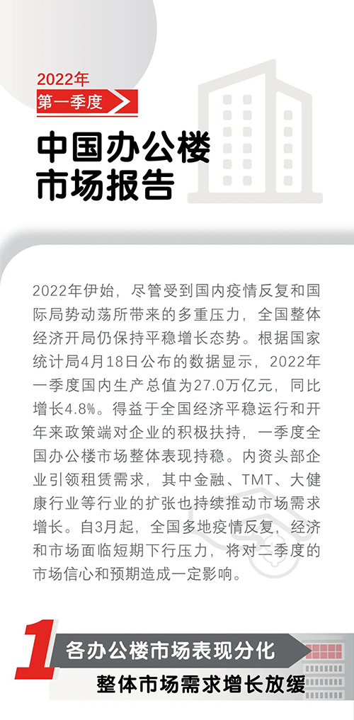 近日,仲量聯(lián)行發(fā)布2022年第一季度中國寫字樓市場報告,一季度,全國辦公樓市場整體表現(xiàn)持穩(wěn),內資頭部企業(yè)引領租賃需求。自3約起,全國多地疫情反復,將對二季度的市場信心和預期造成一定影響。