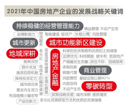 2021年,領軍房企在市場及政策環(huán)境中對其戰(zhàn)略視角進行了適應性調整,未來行業(yè)發(fā)展主旋律在關注“風控管理”、“資產證券化”的同時,也將圍繞“城市功能新區(qū)建設”、“科技賦能”、“地域深耕”和“不動產生態(tài)”等前瞻領域展開精進創(chuàng)新。