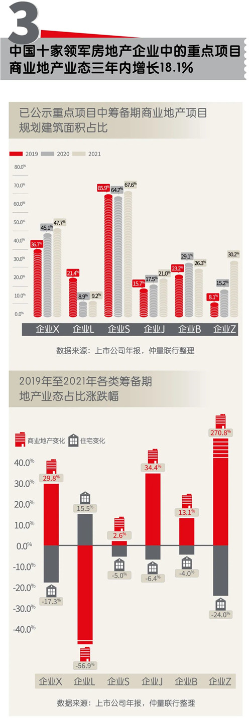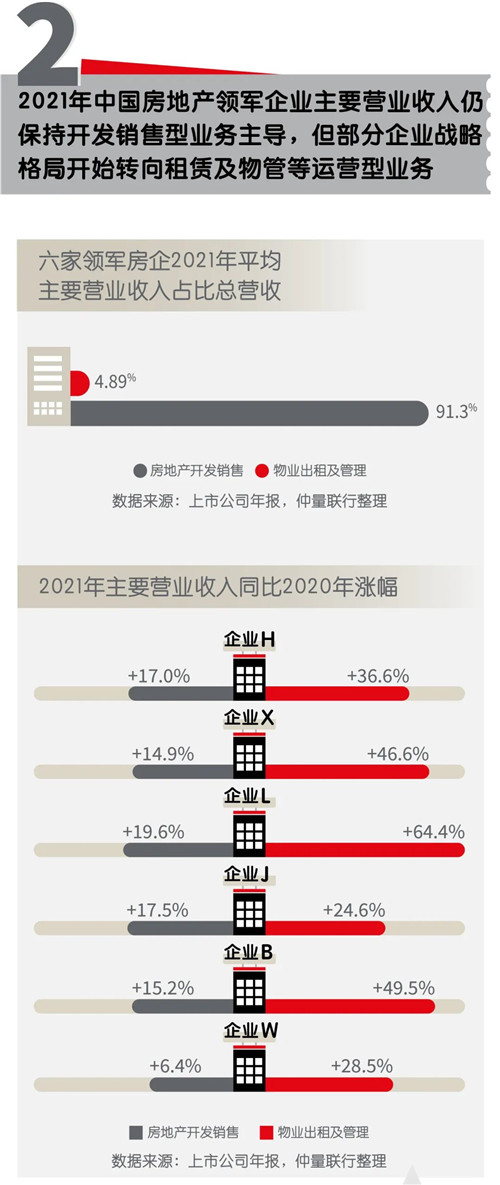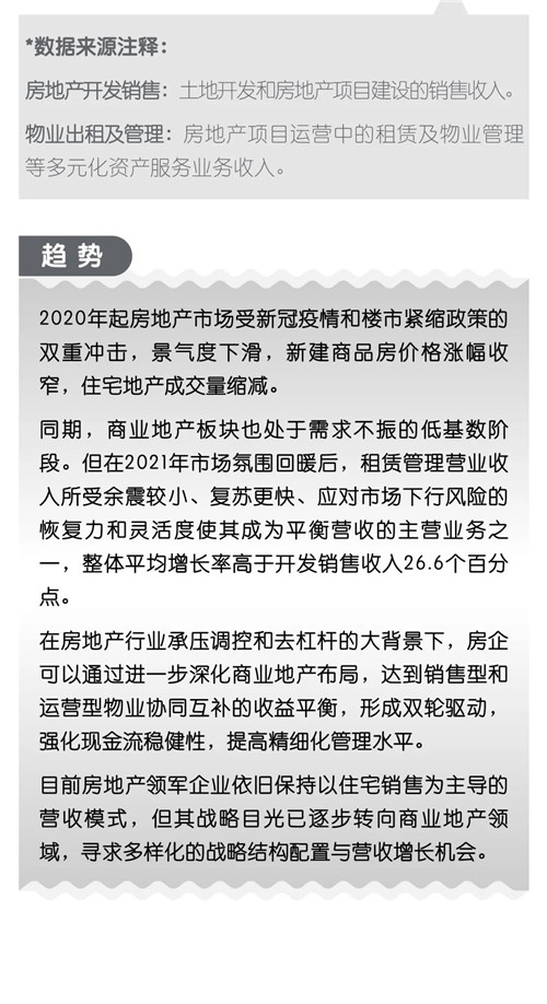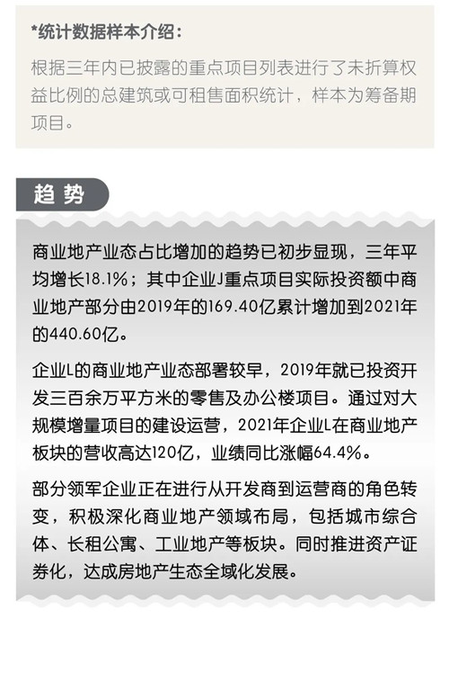 各大房企為適應市場大環(huán)境的變遷,更加重視在全國范圍內的商業(yè)地產的布局。幾家領軍企業(yè)的商業(yè)地產業(yè)態(tài)占比三年平均增長18.1%,業(yè)績平均增長率高于開發(fā)銷售收入的26.6個百分點。當前,商業(yè)地產租賃及服務的高利潤運營業(yè)務模式已獲得更多市場關注度與認可,以優(yōu)質辦公樓、長租公寓、工業(yè)地產為代表。