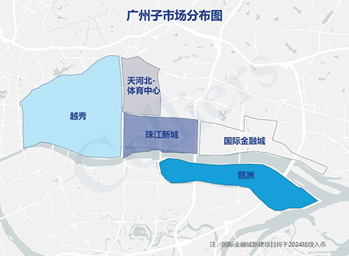截至2022年一季度,廣州甲級(jí)寫字樓市場(chǎng)總存量為617萬平方米,其中珠江新城總存量位居各子市場(chǎng)第一,占比約為全市50%,琶洲市場(chǎng)存量緊隨其后。