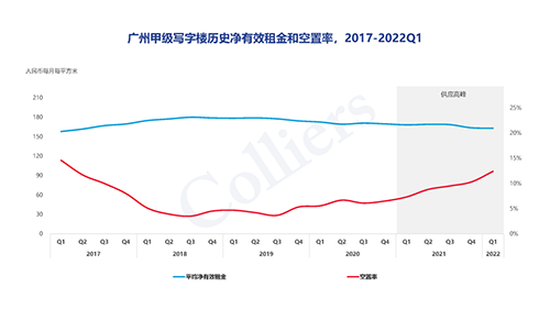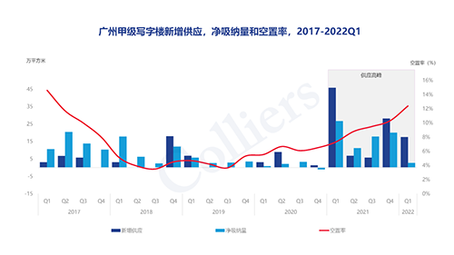 季內(nèi)迎來位于珠江新城和琶洲共兩個(gè)項(xiàng)目入市,新增供應(yīng)面積約17.5萬平方米。預(yù)計(jì)2022全年市場(chǎng)新增供應(yīng)項(xiàng)目總量將達(dá)到12個(gè),總體量約74萬平方米,新增供應(yīng)主要集中在琶洲市場(chǎng)預(yù)計(jì)新項(xiàng)目的集中入市將會(huì)加重琶洲區(qū)域內(nèi)的競(jìng)爭(zhēng)水平,市場(chǎng)租金承壓。