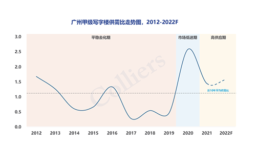 出于疫情原因,2020年廣州市場(chǎng)進(jìn)入低迷期,市場(chǎng)需求跌入歷史十年低谷。在2021年,凈吸納呈現(xiàn)大幅反彈,同時(shí),市場(chǎng)供應(yīng)進(jìn)入高峰期。高力國際預(yù)測(cè)供應(yīng)高峰期將持續(xù)至2024年,市場(chǎng)需求會(huì)逐漸恢復(fù)至常態(tài),供需比走勢(shì)將同步有所提升。