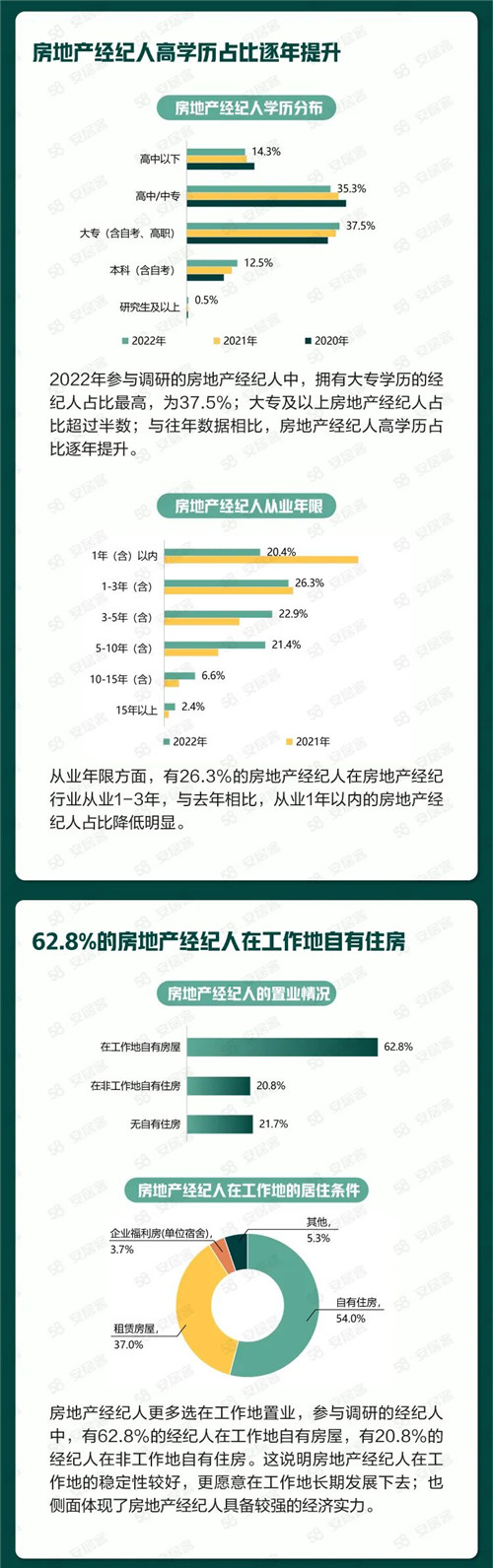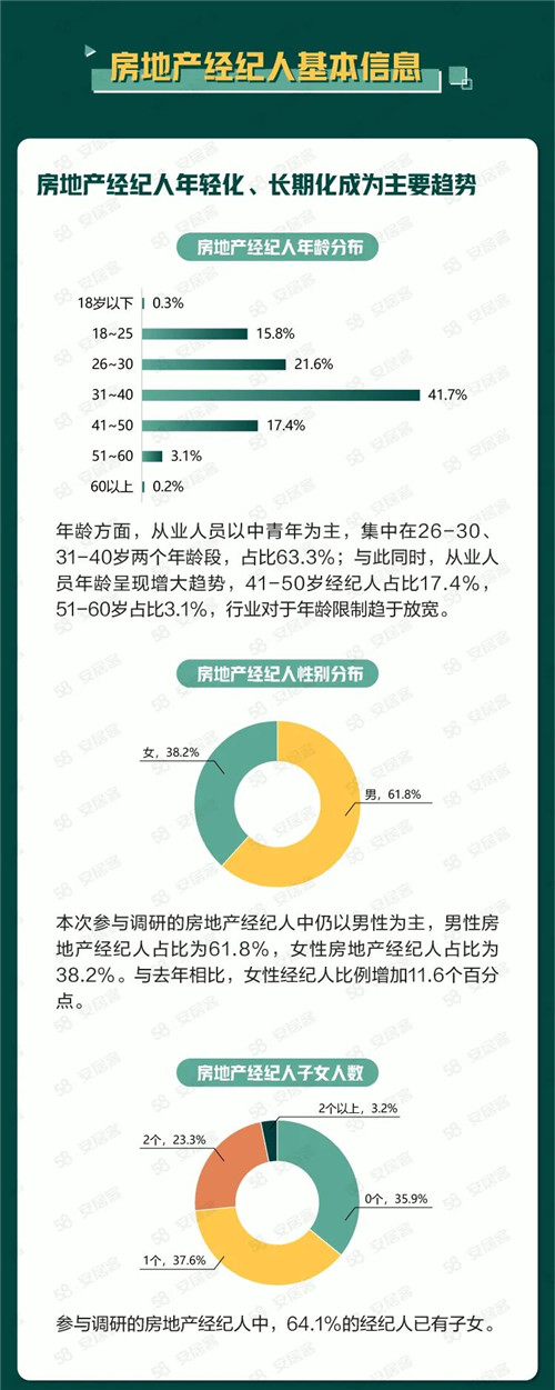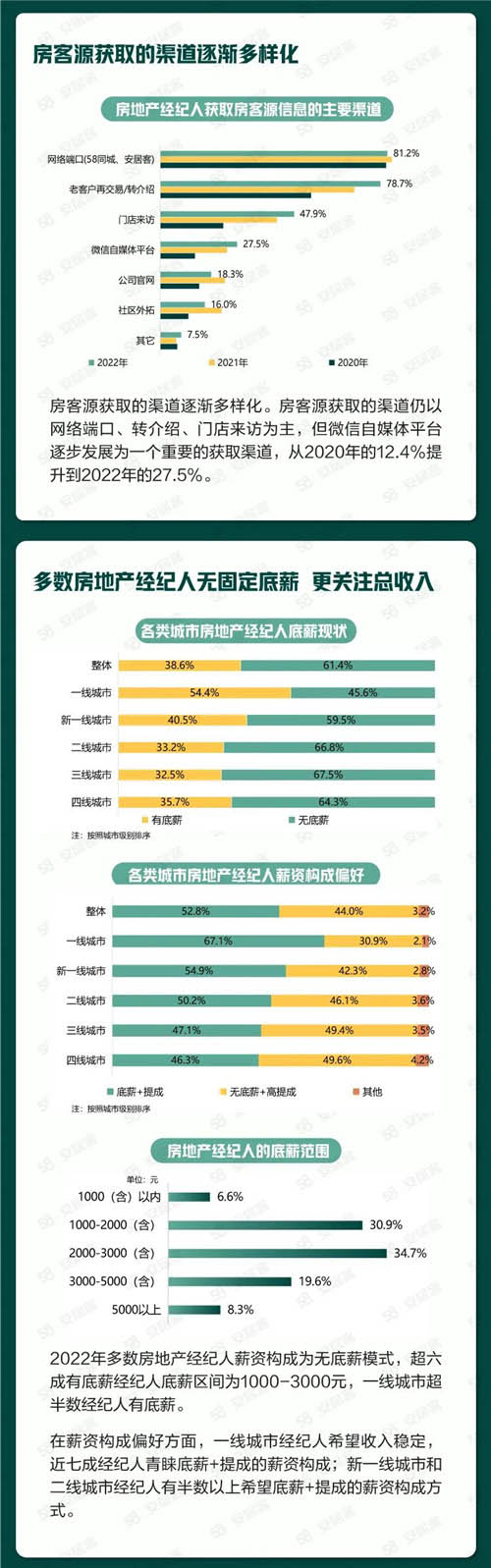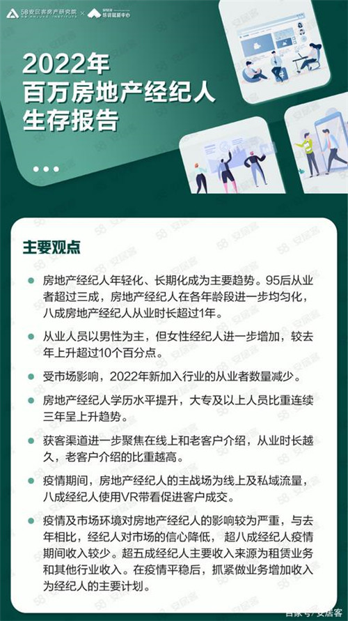 2022年百萬(wàn)房地產(chǎn)經(jīng)紀(jì)人生存報(bào)告已發(fā)布。數(shù)據(jù)顯示,房地產(chǎn)經(jīng)紀(jì)人從業(yè)人員以男性為主,但女性經(jīng)紀(jì)人進(jìn)一步增加,較去年上升超過10個(gè)百分點(diǎn)。受市場(chǎng)影響,2022年新加入行業(yè)的從業(yè)者數(shù)量減少。房地產(chǎn)經(jīng)紀(jì)人學(xué)歷水平提升,大專及以上人員比重連續(xù)三年呈上升趨勢(shì)。獲客渠道進(jìn)一步聚焦在線上和老客戶介紹,從業(yè)時(shí)長(zhǎng)越久,老客戶介紹的比重越高。
