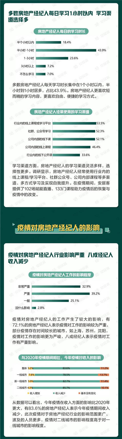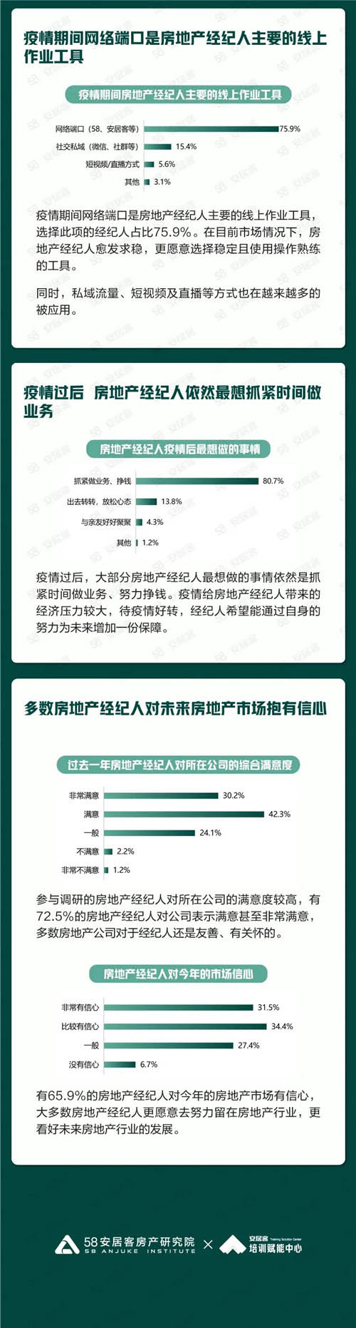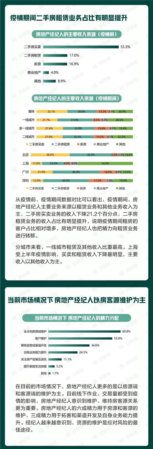 疫情期間,房地產(chǎn)經(jīng)紀(jì)人的主戰(zhàn)場(chǎng)為線上及私域流量,八成經(jīng)紀(jì)人使用VR帶看促進(jìn)客戶成交。疫情及市場(chǎng)環(huán)境對(duì)房地產(chǎn)經(jīng)紀(jì)人的影響較為嚴(yán)重,與去年相比,經(jīng)紀(jì)人對(duì)市場(chǎng)的信心降低, 超八成經(jīng)紀(jì)人疫情期間收入減少。超五成經(jīng)紀(jì)人主要收入來(lái)源為租賃業(yè)務(wù)和其他行業(yè)收入。在疫情平穩(wěn)后,抓緊做業(yè)務(wù)增加收入為經(jīng)紀(jì)人的主要計(jì)劃。