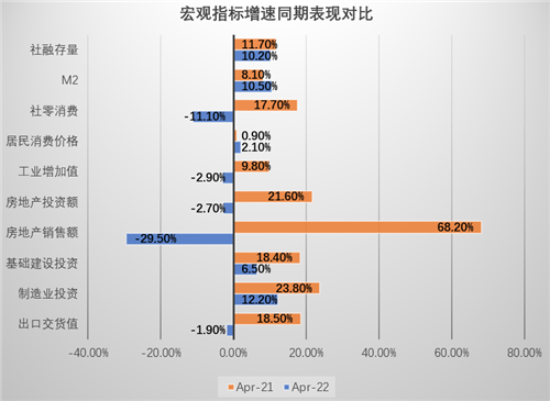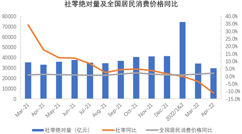 2022年4月整體經(jīng)濟表現(xiàn)較去年同期有較大差距,顯著走弱。從宏觀數(shù)據(jù)可以看出,社融存量增速較去年同期的11.7%放緩至10.2%;而M2增速上漲到兩位數(shù),達到10.5%,高于上月和去年同期。消費端來看,由于疫情影響,社零消費額較去年同期相比增速降為負,其中餐飲消費增速降幅明顯,同比下降22.7%;全國居民消費價格則同比上漲2.1%。