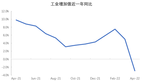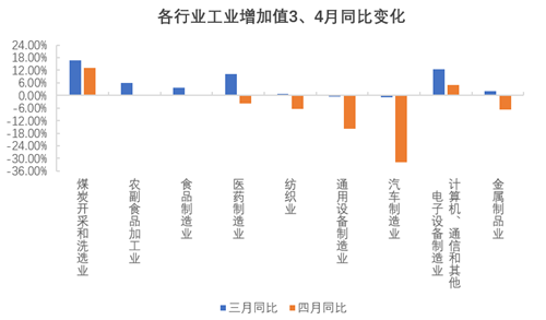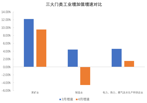 在嚴峻的疫情防控形勢下,國內(nèi)工業(yè)生產(chǎn)增加值由增轉降,同比下降2.9%。三大門類中,采礦業(yè)增加值同比增長9.5%,電力、熱力、燃氣及水生產(chǎn)和供應業(yè)增長1.5%,較三月相比,增速均有一定程度回落;制造業(yè)下滑明顯,同比下降4.6%,增速直接跌為負。
