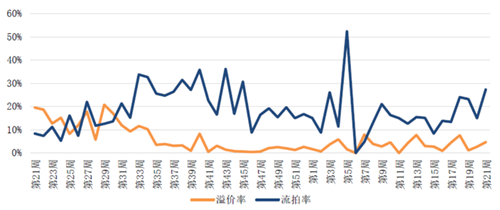 2021年第21周-2022年第21周重點監(jiān)測城市土地溢價率與流拍率走勢(%)