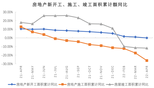 地產(chǎn)投資4月一方面受到疫情影響,開工及銷售受限,另一方面受到市場調(diào)控影響,房企拿地謹慎,投資增速持續(xù)探底。從相關數(shù)據(jù)來看,新開工、竣工和施工面積及拿地增速持續(xù)下行,降幅擴大。從銷售端來看,1-4月份商品房銷售面積同比下降20.9%,銷售額下降29.5%,跌幅進一步加深。