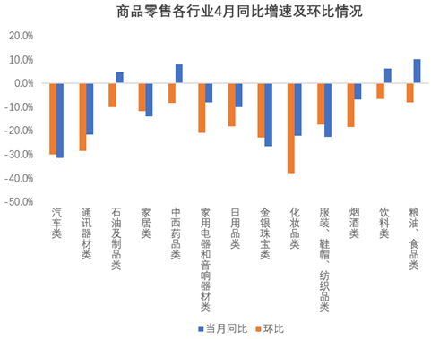 4月國內(nèi)疫情多點頻發(fā),多種疫情防控措施一方面約束居民減少外出購物、就餐需求,另一方面各類型經(jīng)營場所封閉使得餐飲業(yè)及非必需品消費受到較大影響,社會消費品零售同比下降11.1%。其中,商品零售下降9.7%,餐飲收入下降22.7%。零售行業(yè)中除了糧油食品、飲料、石油制品和中西藥品類消費行業(yè)維持正增長,其余均為負增長;加之物流運輸受限,造成產(chǎn)品供應緊張,全國居民消費價格同比上漲了2.1%,略高于前月。伴隨5月疫情好轉,餐飲供應多樣,線上選購及無接觸配送的模式讓居民對于食品、飲料等支出逐漸增加,餐飲消費緩慢復蘇。