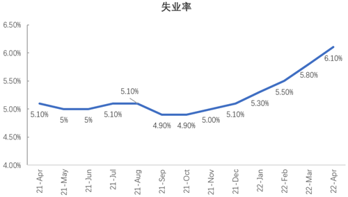 另一方面,失業(yè)率從去年10月一路上升,達到4月6.1%,為近一年最高。全球局勢的不穩(wěn)定,經(jīng)濟環(huán)境日益惡劣,美聯(lián)儲75個基點的加息,加之國內(nèi)受到一波又一波疫情防控影響,企業(yè)波折中停工復工,居民收入預期受挫,消費意愿進一步下滑。