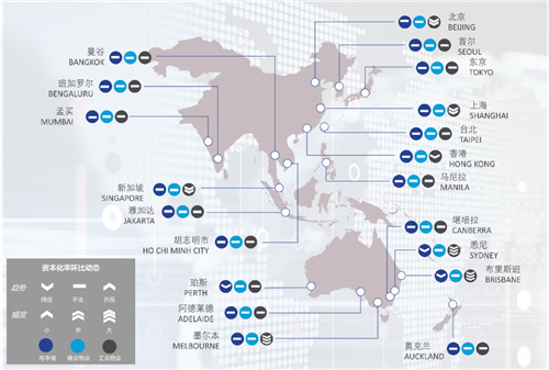 本次報告共覆蓋20個關(guān)鍵城市與地區(qū)的三類主要商業(yè)地產(chǎn)投資市場,其中8個城市環(huán)比資本化率有所波動。亞太地區(qū)工業(yè)市場的投資需求強勁,資本化率進一步下調(diào)。澳大利亞的部分城市寫字樓資本化率有一定下降。