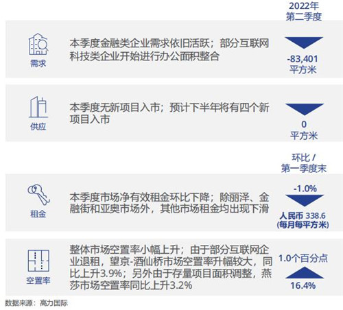 高力國際近日發(fā)布北京第二季度辦公樓報告。本季度北京再次經(jīng)歷了疫情襲擾,大量商務(wù)租賃活動受到影響。由于辦公樓租賃嚴重依賴線下帶看和商務(wù)談判,整體市場在二季度活躍度都大幅降低。高力國際華北區(qū)董事總經(jīng)理嚴區(qū)海表示,二季度北京甲級寫字樓市場的凈吸納量為-8.3萬平方米,是繼2020年一季度后第一次出現(xiàn)負值。本季度市場無新增供應(yīng),受到市場租賃活動放緩、談判周期延長等因素影響,整體空置率小幅回升到16.4%,市場租金也小幅回調(diào)至338.6元每月每平米。
