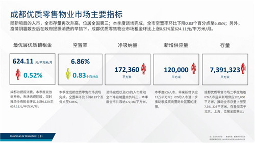隨新項(xiàng)目的入市,全市存量再次升高,位居全國第三;本季度調(diào)場完成,全市空置率環(huán)比下降0.83個(gè)百分點(diǎn)至6.86%;另外,疫情陰霾散去后在政府提振消費(fèi)的舉措下,成都優(yōu)質(zhì)零售物業(yè)市場租金環(huán)比上漲0.52%至624.11元/平方米/月。