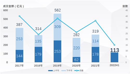 2022年上半年累計(jì)成交金額約113億元,同比下降近37%;同時,成交宗數(shù)15宗與去年上半年18宗相仿,顯示今年的平均成交規(guī)模進(jìn)一步縮水,10億以內(nèi)成交額的交易為市場上的主流,占上半年總成交近九成。整體而言,上半年大宗交易市場延續(xù)了去年下半年以來的市場氛圍,收到全球經(jīng)濟(jì)不確定性持續(xù)以及上半年多地疫情反復(fù)的影響,投資者更加趨于謹(jǐn)慎保守。