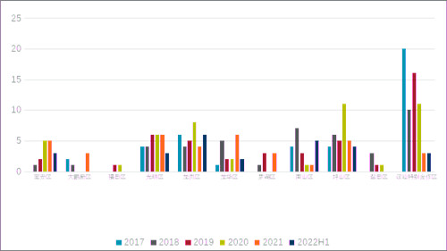 圖8:深圳市各區(qū)2017-2022年上半年工業(yè)用地出讓宗數(shù)統(tǒng)計(jì)