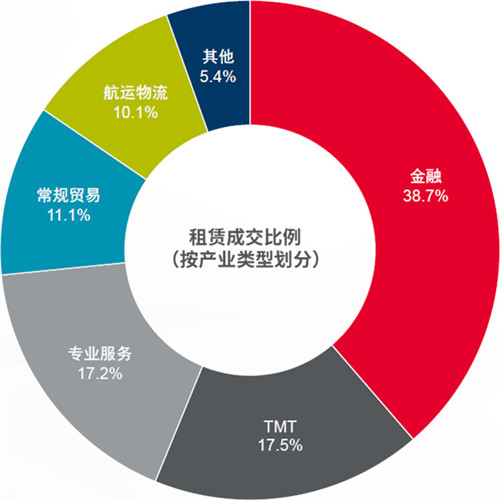 成交租賃方面,金融行業(yè)租賃需求復(fù)蘇明顯,已連續(xù)三個季度占據(jù)首位,本季度仍以38.7%的占比穩(wěn)居首位。此外,TMT與專業(yè)服務(wù)行業(yè)成交分別約占市場成交的17.5%、17.2%。