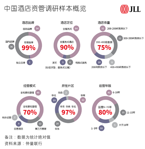 為深入探究這一問題,仲量聯(lián)行針對業(yè)內(nèi)近百位酒店業(yè)主進(jìn)行了問卷調(diào)查,并獲得了大量、豐富、時間跨度涵蓋疫情前后(2019年和2021年)的13項重要酒店運(yùn)營指標(biāo)和資產(chǎn)管理指標(biāo)。參與本次調(diào)查的酒店遍布全國各主要區(qū)域,大部分為規(guī)模在200至400個房間提供全服務(wù)的國際或國內(nèi)連鎖品牌酒店,從酒店的管理模式來看,大約70%為全權(quán)委托管理,此外,17%為第三方管理,13%為自營,可以說是一次對中國酒店行業(yè)資產(chǎn)管理水平的全景描摹。