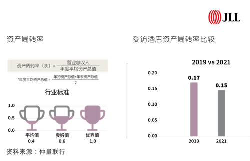 本次調(diào)研結(jié)果顯示出,受疫情影響,資產(chǎn)周轉(zhuǎn)率、資產(chǎn)報酬率、人房比、人均創(chuàng)收和人均創(chuàng)利、經(jīng)營毛利率和息稅折攤前收益率、每間客房平均資本性支出、員工離職率等指標(biāo)均出現(xiàn)下滑。其中資產(chǎn)周轉(zhuǎn)率和資產(chǎn)報酬率在2021年低于國資委考核分配局編制的《企業(yè)績效評價標(biāo)準(zhǔn)值》中記載的住宿和餐飲業(yè)全行業(yè)的平均值。同時國內(nèi)品牌酒店的人均創(chuàng)收能力、人均創(chuàng)利能力都僅相當(dāng)于國際品牌酒店的55%和41%;且無論疫情前后經(jīng)營毛利率和息稅折攤前收益率也均比國際品牌酒店低,但離職率則高于國際品牌酒店,說明在包括財務(wù)管理、人力資源管理等在內(nèi)的資產(chǎn)管理層面,國內(nèi)品牌還有較大的提升空間。