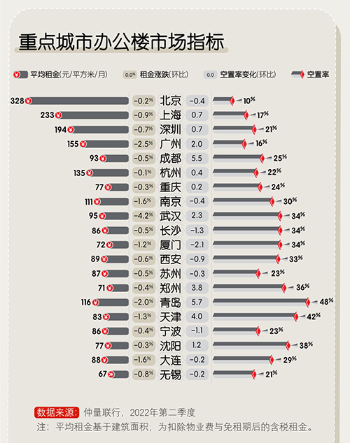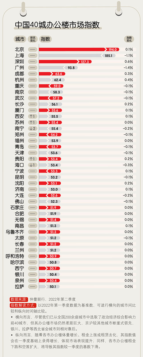 1. 排名前10的城市中,城市位次尚無變動,代表了頭部城市發(fā)展相對成熟的辦公樓市場結(jié)構(gòu)。其中,上海和廣州的指數(shù)變化較大,分別環(huán)比下降1.1%和1.4%。4月至5月疫情爆發(fā)拖累上海二季度的市場表現(xiàn),廣州則因為需求相對疲軟加之空置面積走高,市場去化壓力處于高位。北京、深圳、成都、杭州、長沙的指數(shù)變化錄得小幅正增長,表明其應(yīng)對市場波動的內(nèi)生動力相對充足;