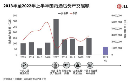 近期中國部分城市新冠疫情反復(fù),導(dǎo)致上半年酒店交易額同比下降43.8%,預(yù)計許多酒店交易活動可能推遲到2022年第四季度或2023年第一季度。仲量聯(lián)行數(shù)據(jù)統(tǒng)計顯示,2022年上半年酒店成交額約為70億人民幣,預(yù)計2022年,中國酒店交易總額將達(dá)到約135億人民幣。
