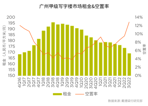 三季度,廣州甲級寫字樓市場共有兩個新項(xiàng)目投入使用,合計(jì)15.3萬平方米,全市總存量突破600萬平方米。受年初以來國內(nèi)疫情反復(fù)對供應(yīng)鏈的巨大影響,市場吸納不及預(yù)期。持續(xù)放量與表現(xiàn)低迷的租賃需求令甲級寫字樓租賃市場繼續(xù)承壓,全市空置率上升至12.9%。全市平均租金繼續(xù)下探,環(huán)比下降2.8%至每月每平方米169.2元。