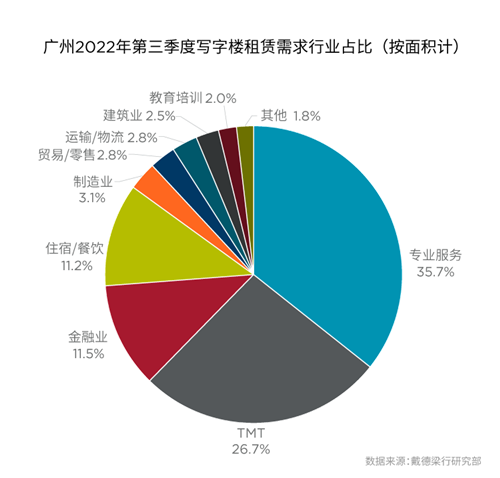 本季度專業(yè)服務(wù)業(yè)繼續(xù)領(lǐng)跑,租賃成交面積占比環(huán)比擴(kuò)大9.9個百分點(diǎn)至35.7%,其中,律所和廣告?zhèn)髅叫枨蟊憩F(xiàn)活躍;ヂ(lián)網(wǎng)行業(yè)本季度租賃成交有所回升,季內(nèi)錄得多家游戲公司有1,000平方米以上的租賃成交,拉動TMT成交面積占比回升12.9個百分點(diǎn)至26.7%。