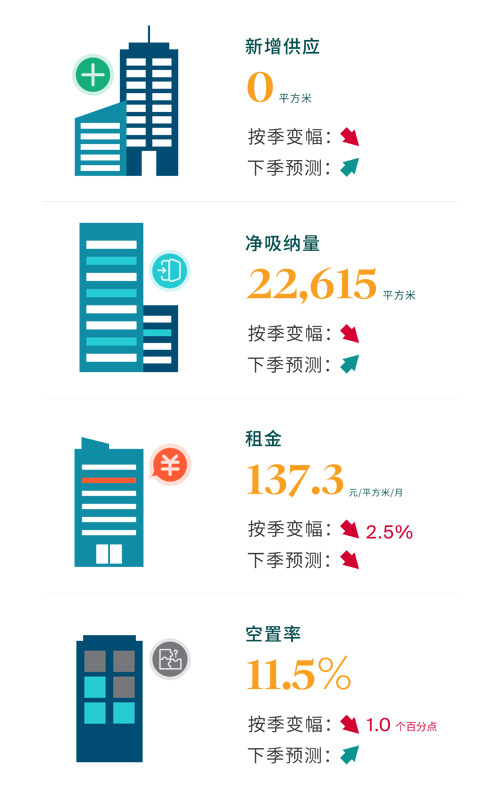 因本季度沒有新增供應(yīng)入市,全市空置率繼續(xù)收窄1.0%至11.5%。值得注意的是,琶洲于本季度凈吸納量領(lǐng)先全市,空置率大幅下降5.7%至17.4%。與之相反的是,珠江新城客戶流出量最大,空置率抬升1.5%。