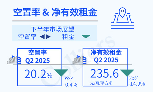 2025年第二季度,北京甲級寫字樓延續(xù)一季度“總量去化、區(qū)域分化”的態(tài)勢。空置率連續(xù)七個季度穩(wěn)定在20%左右的水平,市場正處于新增供需動態(tài)平衡階段。凈有效租金降幅進(jìn)一步收窄,為近三季度最小租金降幅。
