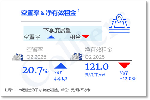 截至2025年二季度末,全市甲級寫字樓凈有效租金錄得121.0元每月每平方米,環(huán)比下降2.6%,同比下降12.0%。上半年,全市甲級樓宇凈有效租金累計下降6.2%,租金降幅較去年同期有所加快。