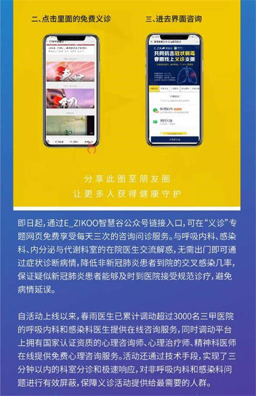疫情無情人有情,隔離病毒不隔離愛。疫情當前,E_ZIKOO智慧谷第一時間積極配合北京市突發(fā)公共衛(wèi)生事件一級響應,建立防控工作責任管理制度,并攜手春雨醫(yī)生開展線上免費義診活動,為居民提供7×24小時、實時在線響應服務,旨在減輕醫(yī)院就診壓力,發(fā)揮互聯(lián)網(wǎng)醫(yī)療作用,齊心協(xié)力助力疫情防控一線,把溫暖送到家。