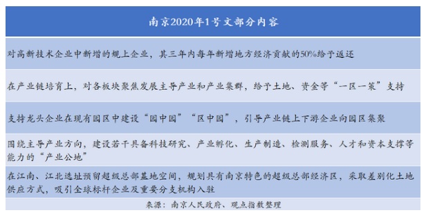同樣在1月2日當(dāng)天,江蘇省會城市南京舉行了“創(chuàng)新名城建設(shè)推進(jìn)大會”,并發(fā)布了一號文件《關(guān)于進(jìn)一步深化創(chuàng)新名城建設(shè)加快提升產(chǎn)業(yè)基礎(chǔ)能力和產(chǎn)業(yè)鏈水平的若干政策措施》,對重要企業(yè)建設(shè)園區(qū)、培育產(chǎn)業(yè)鏈等方面給予土地、資金方面的支持。