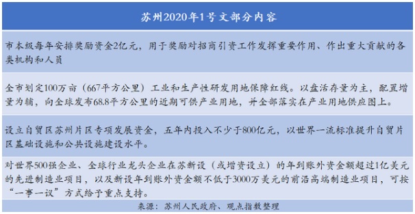 緊跟南京之后,江蘇省另一座城市蘇州在1月3日召開新年第一會——“開放再出發(fā)大會”,同時發(fā)布了一號文件《中共蘇州市委蘇州市人民政府關(guān)于開放再出發(fā)的若干政策意見》,涉及招商引資等方面共30條政策。此外,蘇州在會議上大手筆推出68.8平方公里產(chǎn)業(yè)用地,并與556個項目簽約,投資總額達(dá)7359億元。