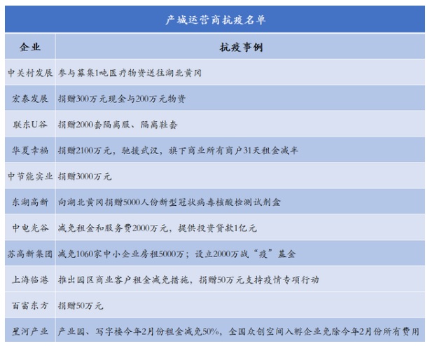 疫情的影響同樣覆蓋到了產(chǎn)業(yè)園區(qū)內(nèi)的中小企業(yè)。為了幫助園區(qū)內(nèi)中小企業(yè)尤其是餐飲、零售等短期內(nèi)經(jīng)營業(yè)績受疫情影響較大的企業(yè)度過難關(guān),部分園區(qū)運營商積極向武漢捐贈醫(yī)療物資,也對園區(qū)商業(yè)客戶提供一定的租金減免。