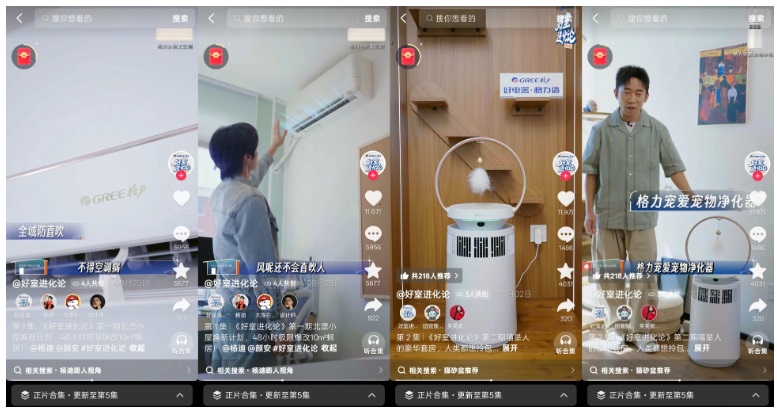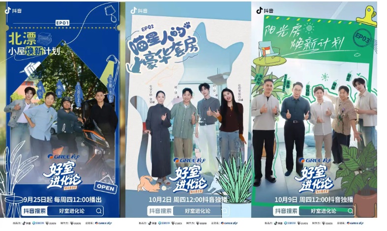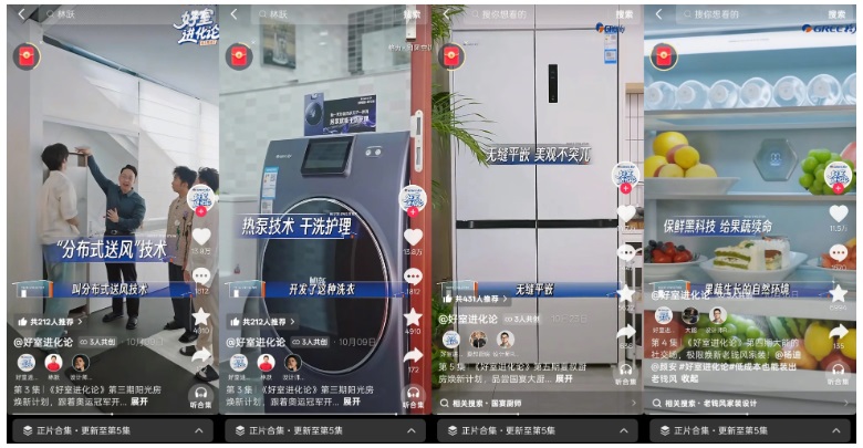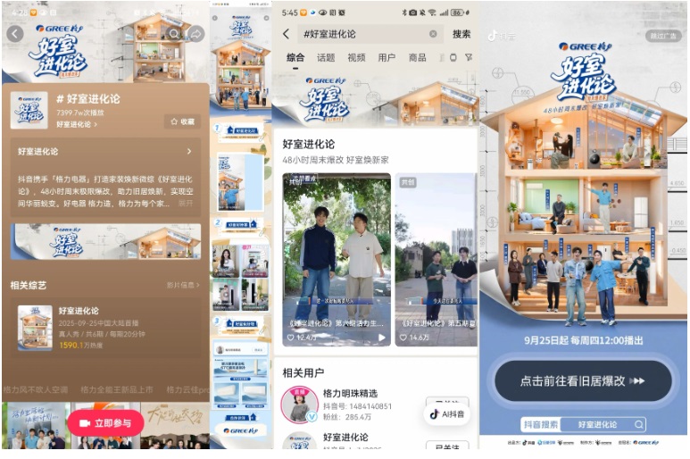 為打通 “觀看—種草—消費(fèi)” 的關(guān)鍵鏈路,「好室進(jìn)化論」IP特別打造H5專題頁面,最大化承接全站熱度,將內(nèi)容價值高效轉(zhuǎn)化為商業(yè)價值。專題頁作為微綜播放入口,支持用戶隨時回看節(jié)目精彩片段;同時整合達(dá)人種草專區(qū),集中展示格力產(chǎn)品在真實(shí)場景中的使用效果;最后設(shè)置 “同款選購” 通道,用戶可直接跳轉(zhuǎn)購買微綜中出現(xiàn)的新國標(biāo)全能王空調(diào)、505荔枝冰箱、鯨濤鋅礦凈水機(jī)等產(chǎn)品。另外,節(jié)目依托抖音平臺強(qiáng)大的流量資源,通過話題頁、開屏廣告、阿拉丁推薦、H5等多渠道全方位導(dǎo)流,最大化覆蓋目標(biāo)受眾。