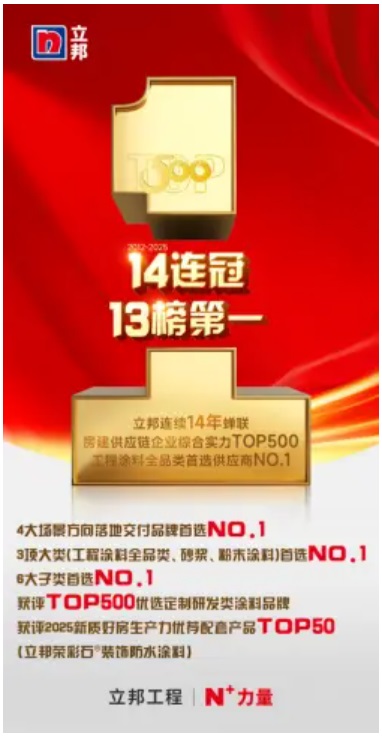立邦連續(xù)14年蟬聯(lián)房建供應(yīng)鏈企業(yè)綜合實(shí)力TOP500首選工程涂料全品類第一