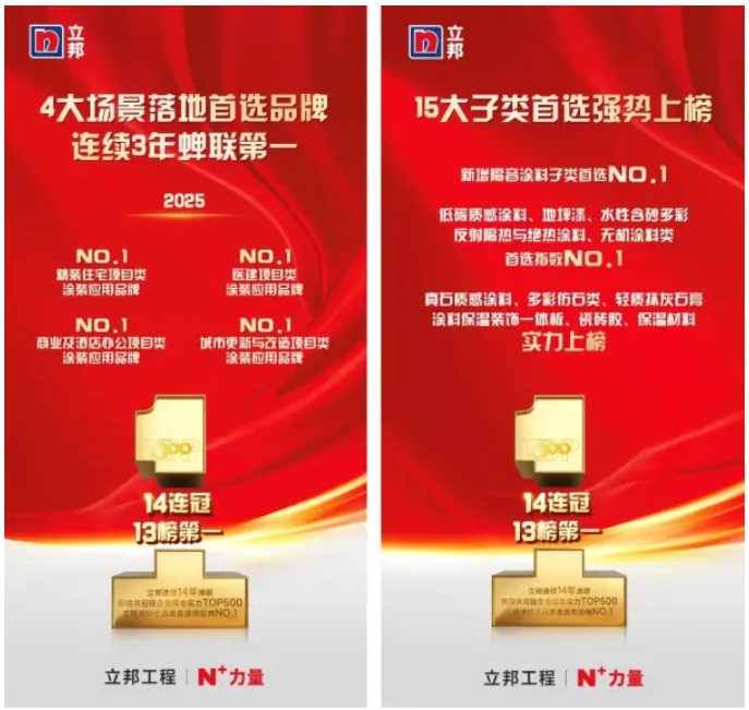 3月19日,由中國房地產(chǎn)業(yè)協(xié)會指導(dǎo),中房優(yōu)采正式發(fā)布《2025房建供應(yīng)鏈企業(yè)綜合實(shí)力TOP500-首選供應(yīng)商服務(wù)商測評報告》,立邦再次獲評工程涂料全品類第一,連續(xù)14年穩(wěn)居行業(yè)榜首。在本次發(fā)布的榜單中,立邦在五大類、十五個子類上榜,穩(wěn)居13項測評榜單冠軍,并在新增的隔音涂料子類榜單中奪冠。