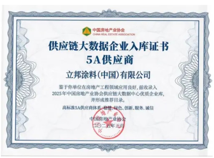 立邦被收錄入中國房地產(chǎn)業(yè)協(xié)會供應(yīng)鏈大數(shù)據(jù)中心并高標(biāo)準(zhǔn)“5A供應(yīng)商”(5A即5大能力)企業(yè)庫