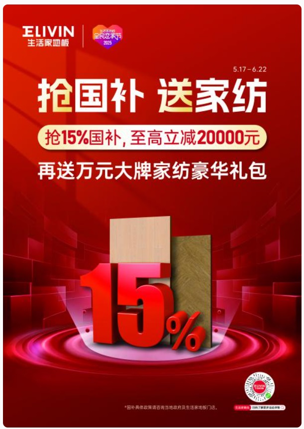 2025 年,家居國補(bǔ)政策的出臺為建材家居行業(yè)帶來了新的發(fā)展機(jī)遇。生活家地板敏銳捕捉政策契機(jī),將 15% 國補(bǔ)融入第九屆全民戀家節(jié),以 " 政企雙補(bǔ) " 的模式實(shí)現(xiàn)政府補(bǔ)貼與企業(yè)讓利的疊加效應(yīng)。這一舉措不僅讓消費(fèi)者得到了實(shí)實(shí)在在的優(yōu)惠,更體現(xiàn)了生活家地板的社會責(zé)任感和品牌擔(dān)當(dāng)。